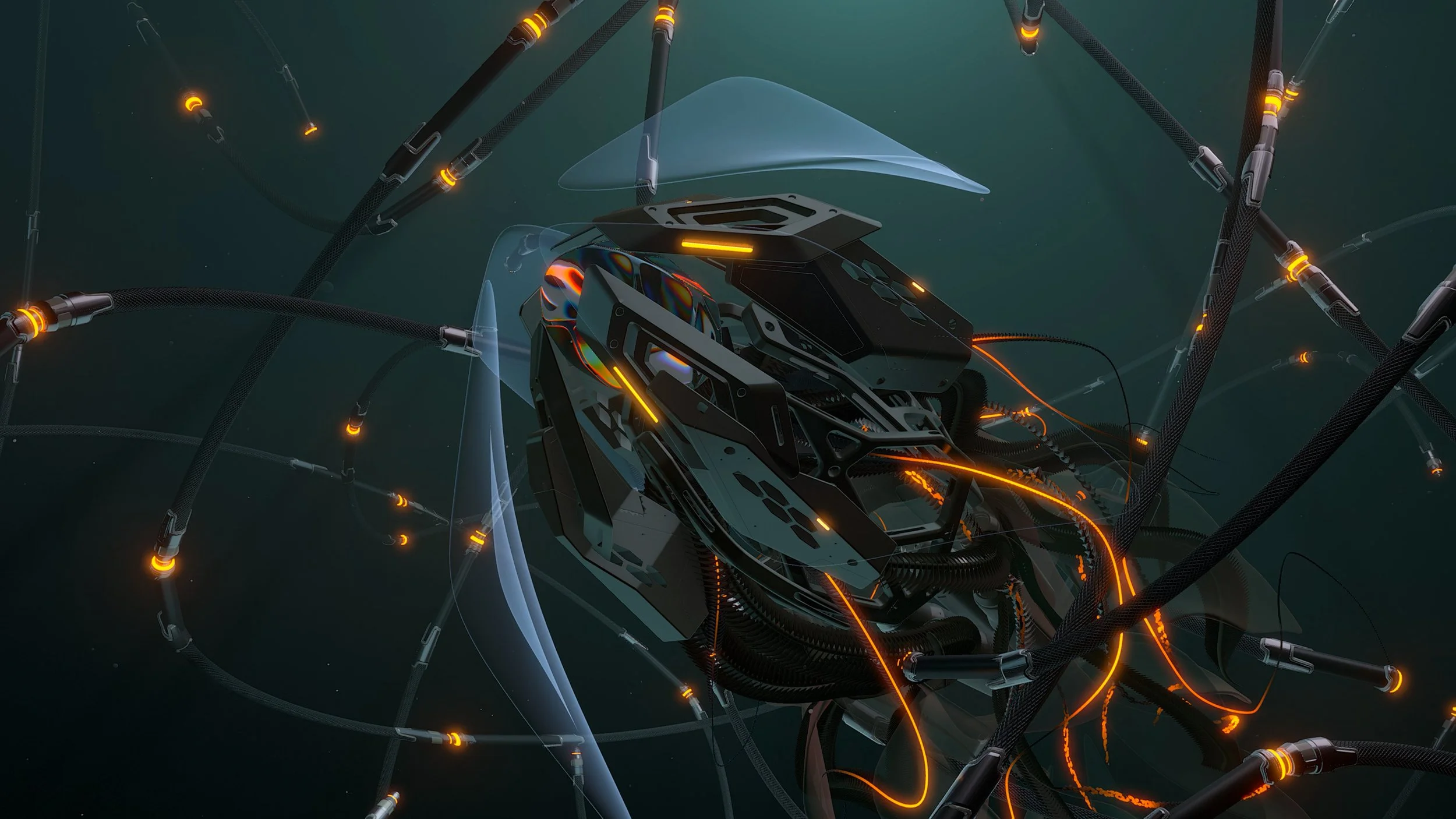The Xenodrifter glides through layers of ecologies. Submerged - searching yet surging - vibrant and sentient, cable lattices enmesh chromatic bursts, a vital symbiosis of the entity’s evolving energy state. Synaptic discharges bloom radiance: uplink to the chaotic sublime.